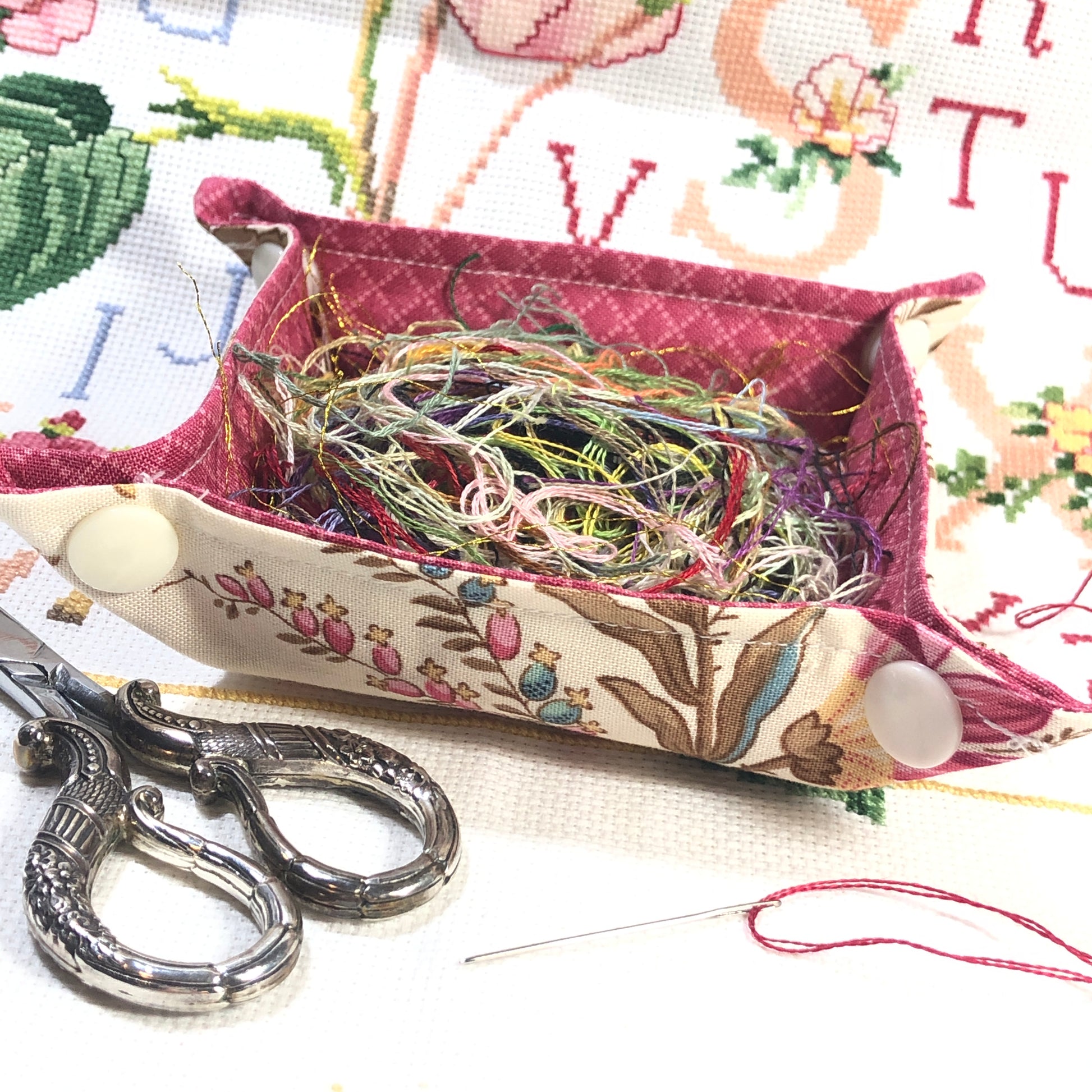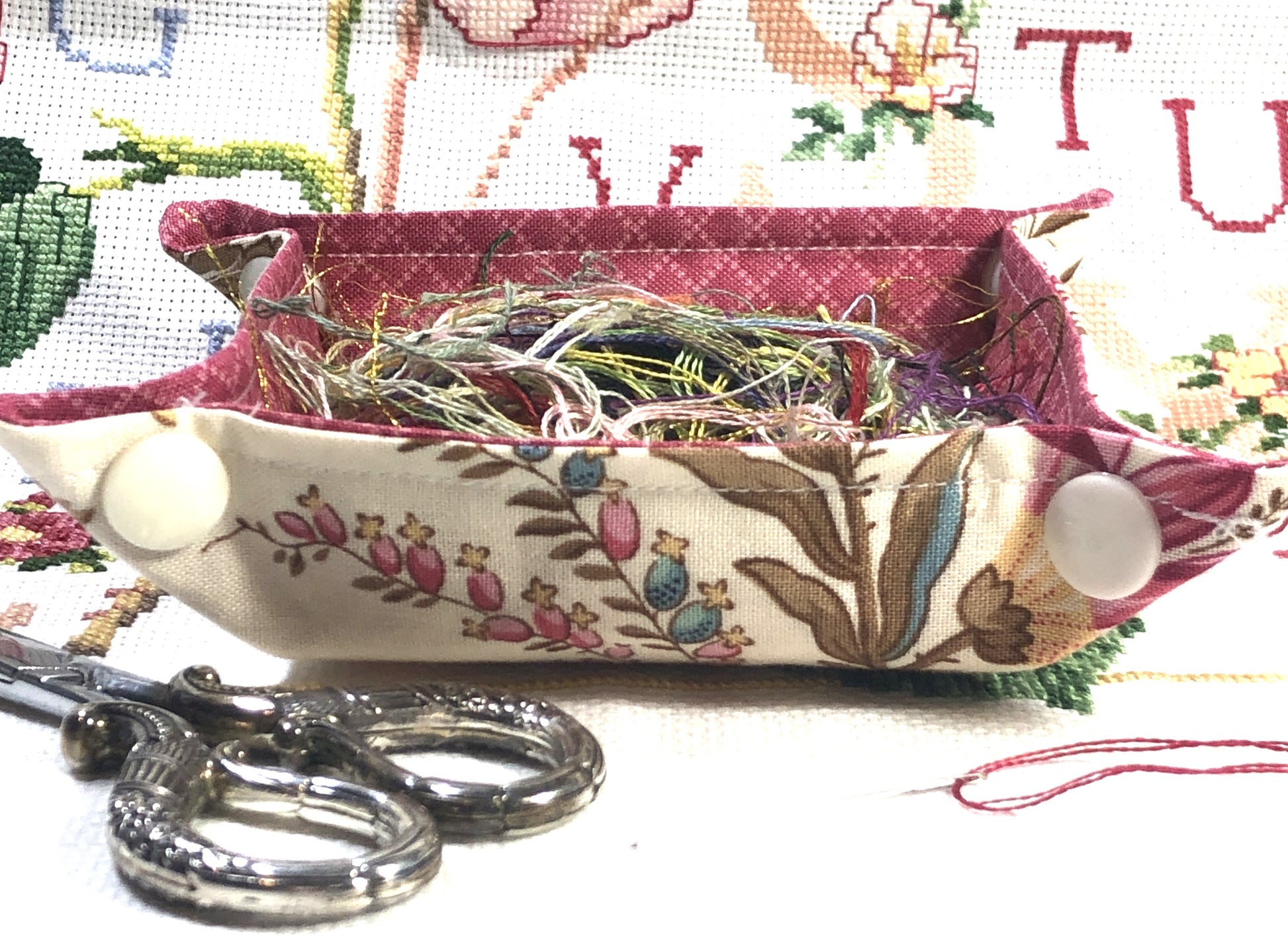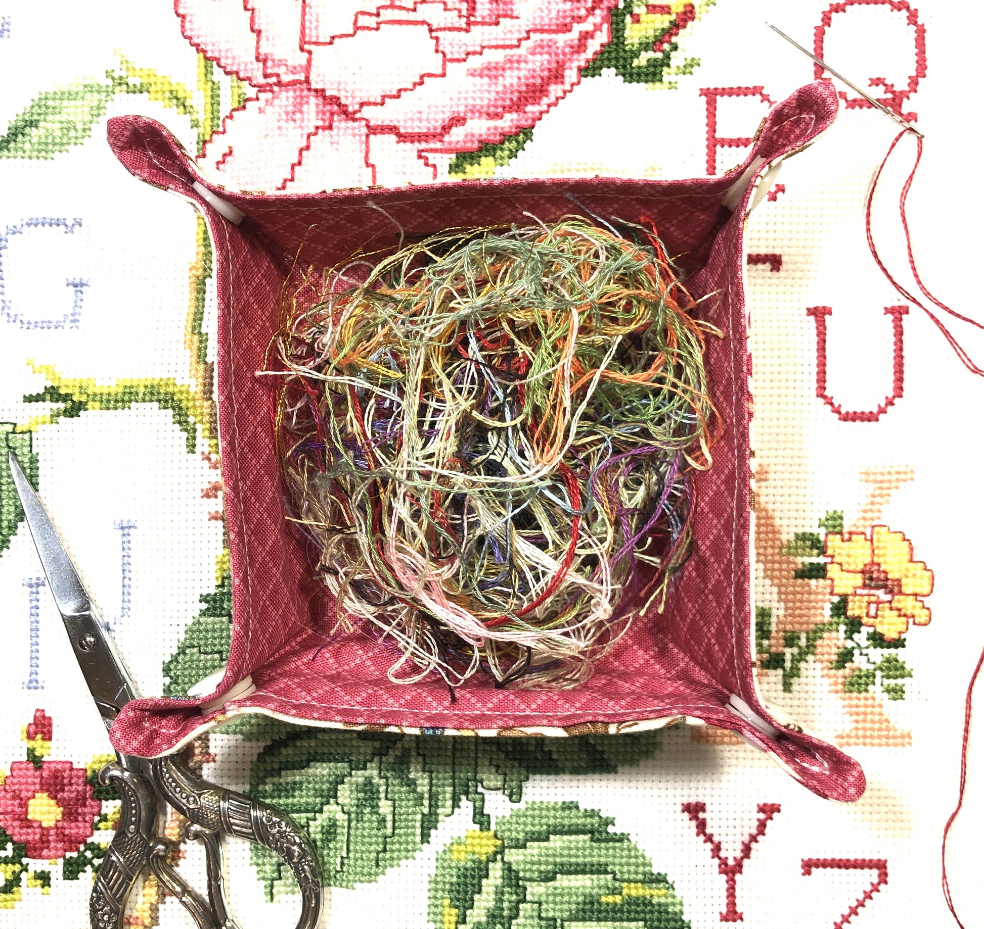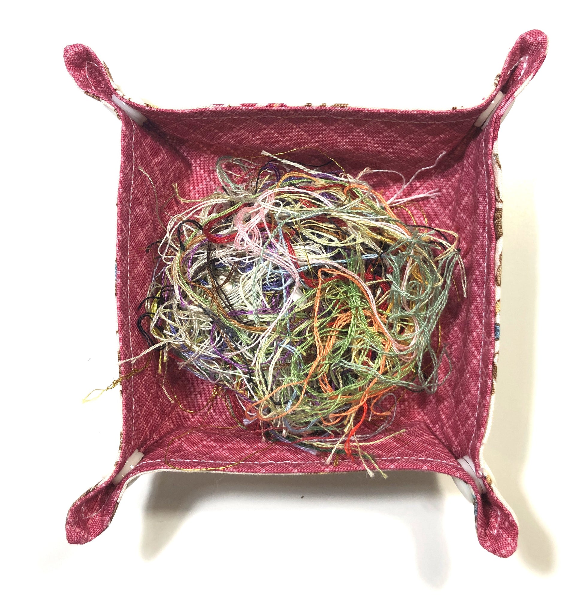 A handy collapsible container to put all your threads in when you finish a thread. Instead of them being all over you or the floor, this handy little cotton bin will keep the mess contained.